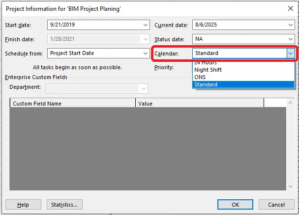 نکته: برای تعریف روز شروع هفته و ماه شروع سال و ساعت شروع و پایان کار و … از قسمت options – Schedule – Calendar options for this project میتوان اقدام کرد.